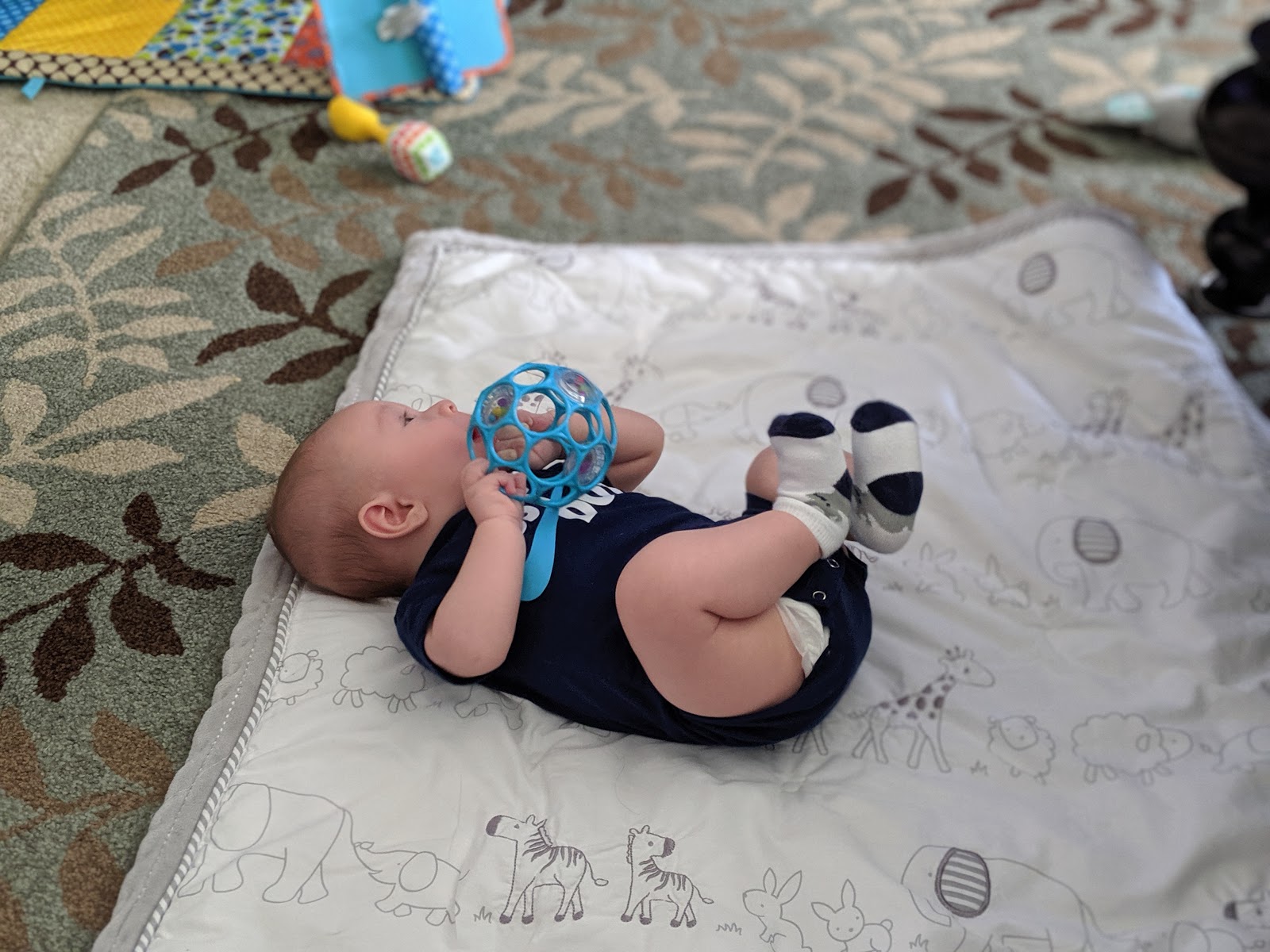 - At the beginning of this month, he started to grab things so we broke out the toys.